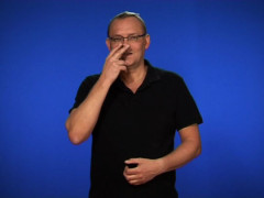 V-handen, uppåtriktad och inåtvänd, kontakt med näsan, förs kort framåt, upprepas