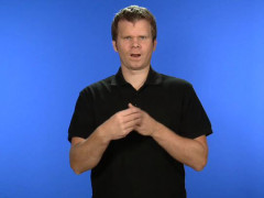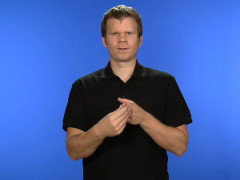 Tumvinkelhanden, vänsterriktad och inåtvänd, hakas framför flata handen, framåtriktad och högervänd, slås framåt ett par gånger med bibehållen kontakt