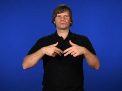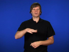 V-händer, nedåtriktade och inåtvända, den högra snett bakom den vänstra, förs framåt samtidigt som fingrarna spelar // Flata handen, framåtriktad och nedåtvänd, förs i vänstergående cirkel