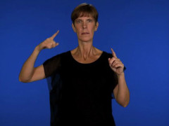 Pekfingret, framåtriktat och nedåtvänt, kontakt bredvid pekfingret, framåtriktat och nedåtvänt, förs åt höger samtidigt som det förs upp och ner