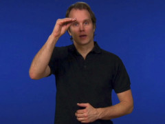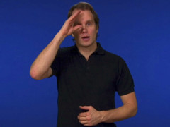 Tumvinkelhanden, uppåtriktad och vänstervänd, kontakt med pannan, förs sedan framåt samtidigt som den förändras till A-hand
