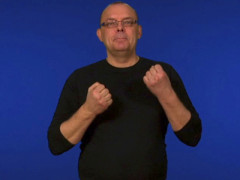 Knutna händer, riktade mot varandra och inåtvända, förs upp och ner växelvis ett par gånger // 4-handen, uppåtriktad och vänstervänd, kontakt bakom 4-handen, uppåtriktad och högervänd, förs inåt