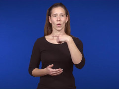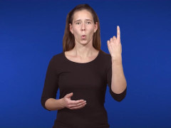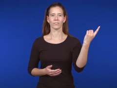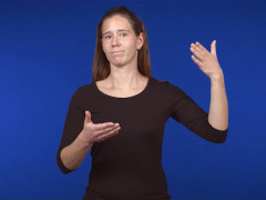 Pekfingret, uppåtriktat och inåtvänt, förs i vänstergående cirkel i huvudhöjd // Flata handen, vänsterriktad och inåtvänd, förs åt höger till kontakt med flata handen, framåtriktad och uppåtvänd