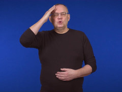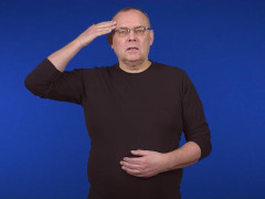 Flata handen, uppåtriktad och inåtvänd, förs kort åt höger med bibehållen kontakt bredvid pannan samtidigt som den slås åt vänster