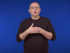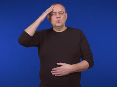 Flata handen, vänsterriktad och inåtvänd, förs i nedåtgående cirklar med bibehållen kontakt framför flata handen, högerriktad och inåtvänd // Flata handen, uppåtriktad och vänstervänd, upprepade kontakter bredvid pannan